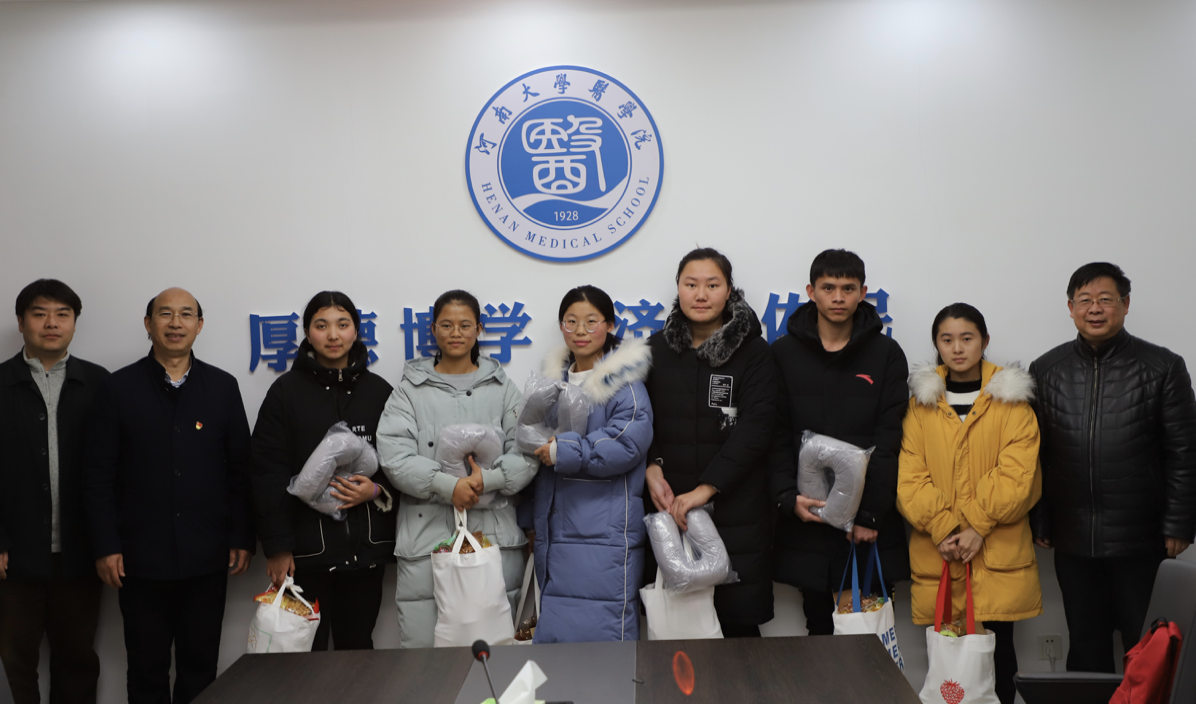 贾天明书记和王丙增副书记首先与同学们进行了亲切地谈话,了解每位同学一学期来的学习、生活及家庭条件等基本情况。在同学们谈论到自己的家乡时,贾天明书记还回忆起了第一次在海南招生和年少求学时的趣事,并提醒同学们读万卷书、行万里路,切勿荒废假期时光。接着,贾书记给受助学生带去了学院领导老师们对他们深情的关怀和殷切的期望。学院考虑到这些同学家庭经济条件比较困难,而且离家非常远,有的同学需要坐30多个小时的火车,特意为他们准备了一些火车上必需品和开封特产,希望同学们能够克服旅途的艰辛、生活的困难,好好珍惜大学时光,提升综合素质能力,用知识改变命运。王丙增副院长将温暖大礼包递给同学们并表达了对他们及他们家人的祝福。
