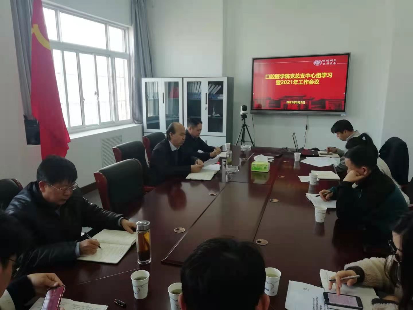 3月3日上午,350vip8888新葡的京集团在校医院学院党员活动室召开党总支中心组学习会议暨2021年工作会议,集中学习了习近平总书记在党史学习教育动员大会上的讲话精神及《中国共产党统一战线工作条例》和《350vip8888新葡的京集团2021年工作要点》,安排部署了学院2021年工作重点。学院全体领导、各科室负责人、各党支部书记参加会议,会议由院党总支书记贾天明主持。