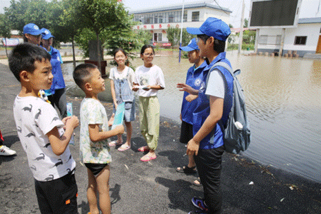 7月25日,团队成员跟随全国优秀共产党员陈晓磐走进大袁村开展“‘河’你一起,共渡‘南’关”主题活动。团队成员为村民讲解洪涝过后的安全注意事项。由于受灾地区卫生状况恶化,极易发生各种传染病,队员们就此给村民进行科普,预防“大灾之后有大疫”。与此同时,为防止溺水事故发生,团队成员积极与村里的儿童沟通交流,开展防溺水安全教育活动。