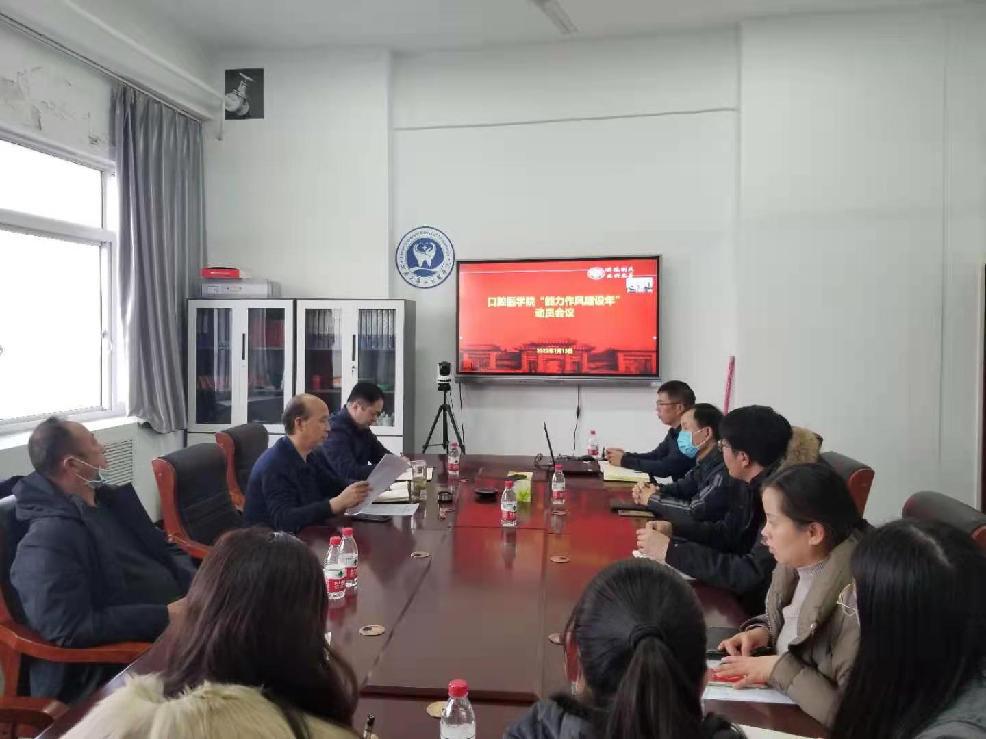 最后,贾天明做了总结讲话,他回顾了学院一年来的工作并对2022年重点工作进行了部署。讲话中,他对取得成绩进行了肯定,对同志们的付出表示了感谢,也对工作中存在的问题进行了剖析。他指出,2022年,学院将面临口腔医学专业认证准备、省重点学科终期验收、专业学位授权点中期合格评估和临床、科研平台建设等多项艰巨任务,希望同志们以“能力发展建设年”为契机,主动学习,主动谋划,开拓创新,善作善成,全面推动学院事业发展,为学校“双一流”建设以及110周年校庆增光添彩,以优异的成绩迎接党的二十大胜利召开。