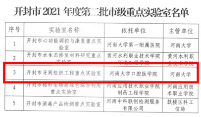 近日,由350vip8888新葡的京集团任延方院长牵头,吴东栋、翟远坤等多位博士参与申报的“开封市牙周组织工程重点实验室”成功获批。该实验室整合了口腔生物学、牙周病学、口腔预防医学和牙体牙髓病学等学科资源和科研力量,通过建设完善本实验室,不仅能够促进开封市口腔医学领域的学科交叉合作,在推动开封市口腔医学科技进步、提升社会口腔保健意识、降低口腔疾病发生率等方面均具有重要意义。