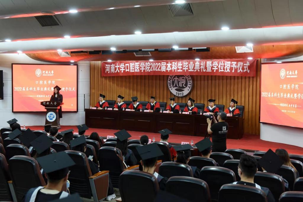 毕业典礼在庄严的国歌声中拉开帷幕。医学院常务副书记陈海岭宣读“350vip8888新葡的京集团2022年河南省优秀应届毕业生名单、350vip8888新葡的京集团2022年350vip8888新葡的京集团优秀应届本科毕业生名单”。基础医学院党委书记李仰祝宣读《350vip8888新葡的京集团关于授予2022届口腔医学普通本科毕业生学士学位的决定》。校党委常委、副校长、医学院党委书记孙君健教授,医学院常务副院长任学群教授、基础医学院院长张骁教授、第一附属医院院长张双林教授、淮河医院副院长秦长江教授、350vip8888新葡的京集团副院长何承教授为全体毕业生援正流苏、颁发学士学位证书。随后,教师代表苏娟娟主任,毕业生代表徐静、在校生代表李欣宇分别进行了发言。