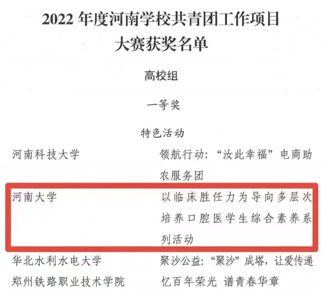 近日,新葡的京官网“以临床胜任力为导向多层次培养口腔医学生综合素养系列活动”项目荣获2022年度“活力杯”河南学校共青团基层基础工作大赛一等奖。