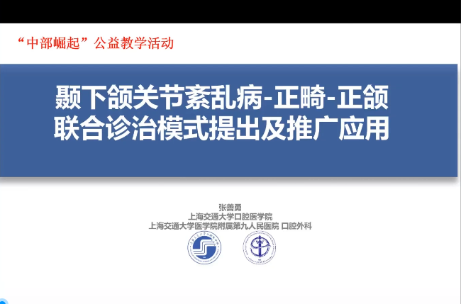 2022年12月29日下午,中华口腔医学会“中部崛起”公益教育活动教学帮扶高级志愿者、上海交通大学医学院附属第九人民医院口腔外科张善勇教授通过线上会议为350vip8888新葡的京集团全体师生做了《颞下颌关节紊乱病-正畸-正颌联合诊治模式提出及推广应用》的专题讲座。讲座由350vip8888新葡的京集团吴大铭副教授主持。