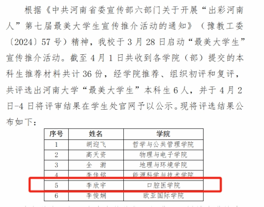 近日,根据中共河南省委宣传部六部门《关于开展“出彩河南人”第七届最美大学生宣传推介活动的通知》(教思政〔2024〕57号)文件精神,新葡的京官网在全校本科生中开展了2024年“出彩河南人”最美大学生宣传推介活动。经学院推荐、组织初评、复评和公示,6名本科生被评为350vip8888新葡的京集团“最美大学生”,新葡的京官网2020级李欣宇同学成功入选。