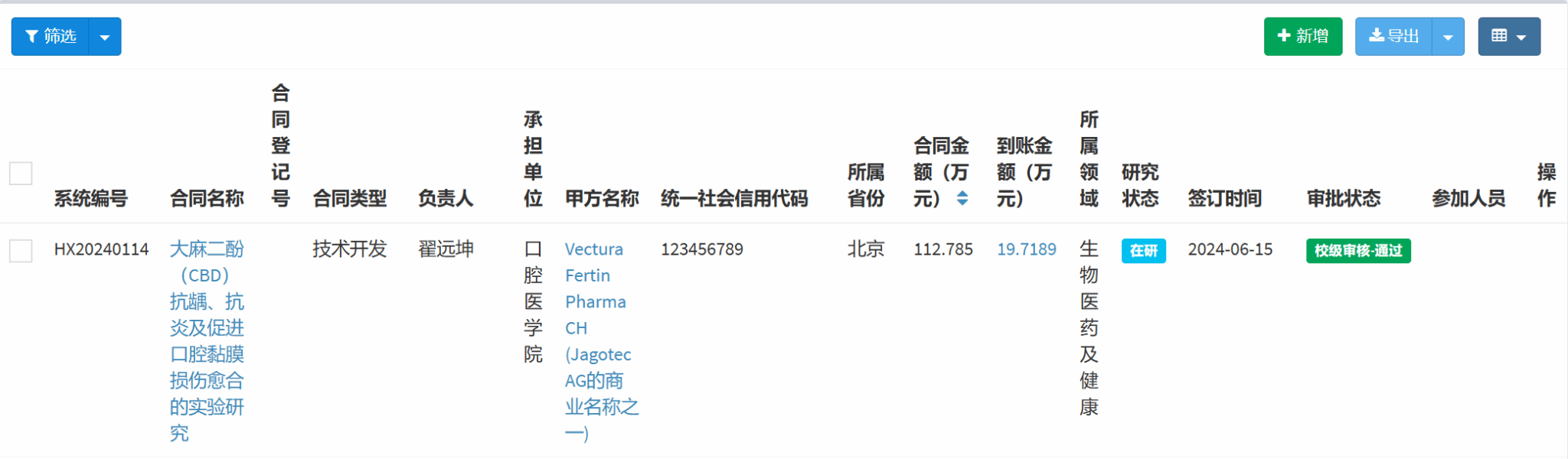 此次合作课题聚焦于天然产物-大麻二酚在口腔疾病领域的应用,突破现有技术瓶颈,为口腔常见疾病(包括龋病、牙周及黏膜炎症)的临床治疗提供创新性解决方案。该项目合同金额155660美元(折合人民币112.785万元),首批资金27117美元(折合人民币约20万元)已到位。