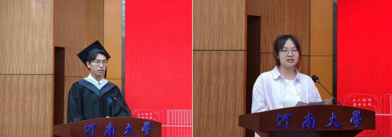 毕业生代表许峻阁发言,他恳切表达了对母校和导师们悉心栽培的感激和对学弟学妹们的鼓励,也表示将以牙体为纸,以器械为笔,在守护口腔健康的“方寸战场”上书写青年医者的担当!在校生代表岳满发言,既向学长学姐们送上筑梦新程的祝福,也表达了与在校同窗深耕专业的共勉。